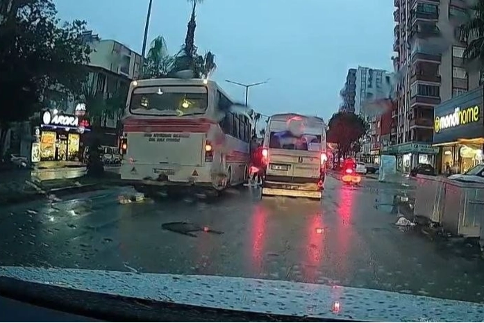 Bir süre sonra otobüs sürücüsü, minibüse arkadan çarptı ve maddi hasarlı kazaya sebep oldu. O anlar, caddeden geçen başka bir aracın araç içi kamerasına saniye saniye yansıdı.