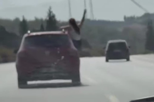 Adana’da otoyolda seyreden cipte yolcu olarak bulunan kadın, cama çıkıp aracın kapısına oturarak yolculuk yaptı.Olay, TAG otoyolunda yaşandı. Alınan bilgiye göre, otoyolda seyrede cipte yolcu olarak bulunan bir kadın cama çıkıp aracın kapısına oturdu. Ellerini de açarak bir süre böyle yolculuk yapan kadın yürekleri ağza getirdi. O anlar başka bir sürücü tarafından cep telefonu ile kaydedildi.