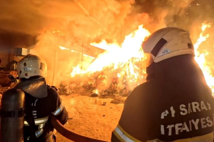 Aksaray’da geri dönüşüm tesisinde kundaklama sonucu çıkan yangında tesisteki plastik ve kağıt balyaları alev alev yandı. Alev topuna dönen balyalarla itfaiye ekipleri su ile müdahale ederken vatandaşlar kepçelerle alevlere müdahale etti. O anlar anbean kameralara yansıdı.