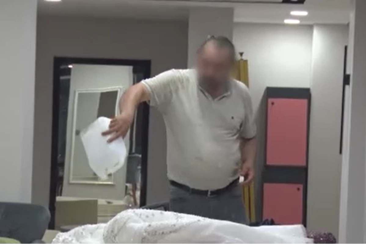 İş yerinin satılacağını duyunca gelinlikleri parçalayıp üzerine kolonya döktüBelirtilen adrese gelen ekipler, kolonya ve dezenfektanı gelinliklerin üzerine döküp elinde çakmakla gezen Bahadır T.'yi uzun süre ikna etmeye çalıştı. Eşinin çocuklarını göstermediğini ve onların velayetini almak istediğini belirten Bahadır T. yine eşinin gelinlik mağazasının sattığını ileri sürüp eylemi bu yüzden yaptığını söyledi. Ekiplerin tüm çabalarına rağmen gelinlikleri parçalamaya devam edip içerideki eşyalara da zarar veren Bahadır T. bir süre sonra ise üst kattan aldığı mutfak tüpünü getirdi.
