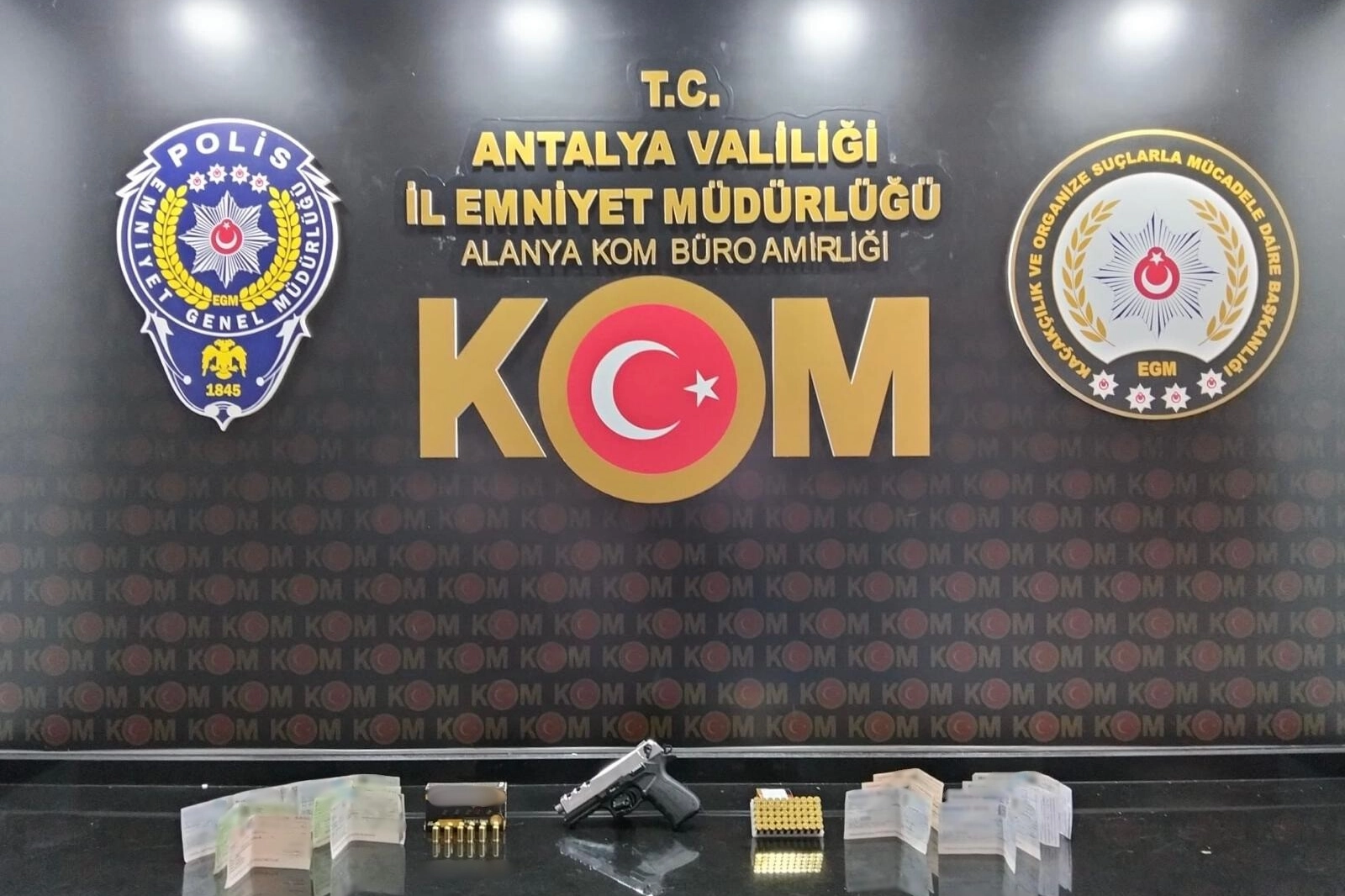 Alanya KOM Büro Amirliği ekiplerinin de destek verdiği operasyonda, suç örgütünün esnafa baskı yaparak haraç topladığı tespit edildi. Yapılan aramalarda, 15 adet çek, 1 adet tabanca ve 50 adet fişek ele geçirildi.