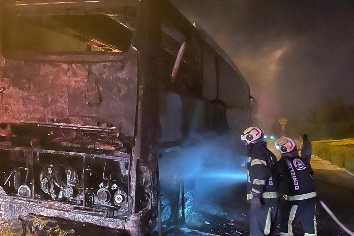 Denizli’nin Pamukkale ilçesinde seyir halindeki bir tur otobüsünde çıkan yangın paniğe neden oldu. Gökpınar Mahallesi Atatürk Bulvarı yan yolunda meydana gelen olayda, motor kısmından yükselen alevler kısa sürede tüm aracı sardı. İtfaiye ekiplerinin hızlı müdahalesiyle yangın kontrol altına alınsa da otobüs kullanılamaz hale geldi. Otobüs sürücüsü duman ve alevi fark etmesiyle aracını yol kenarına park ederek müdahale etmek istedi. Sürücünün girişimleri sonuçsuz kalırken, çevredeki vatandaşlar 112 Acil Çağrı Merkezine ihbarda bulundu. İhbar üzerine bölgeye sevk edilen itfaiye ekipleri alevleri kontrol altına aldı. Otobüsü saran alevler kontrol altına alınırken, araç ise kullanılmaz hale geldiği görüldü.