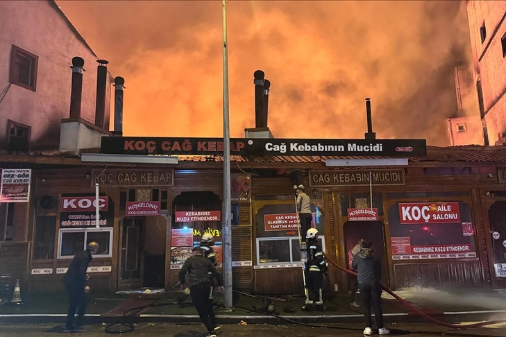 Restoranın yanındaki binaların çatısına da sıçrayan ve kontrol altına alınan yangına, itfaiye ekiplerinin çalışması sürüyor.