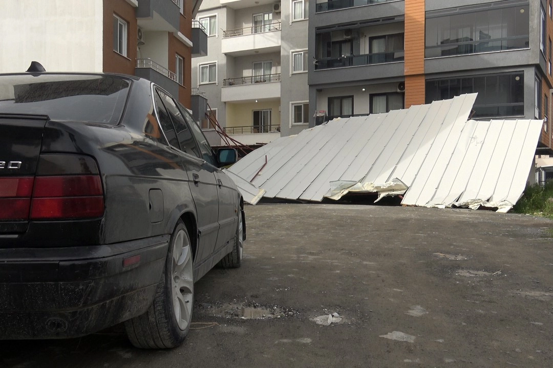 Hatay'ın Arsuz ilçesinde kuvvetli fırtına nedeniyle uçan bir apartman çatısı, park halindeki 3 otomobil ve 1 motosiklete zarar verdi. Olay anı güvenlik kameralarına yansırken, maddi hasarın oluştuğu olayla ilgili tutanak tutuldu.