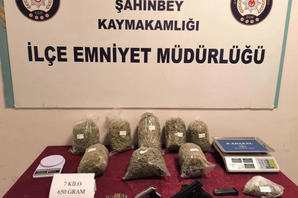 Gaziantep Emniyet Müdürlüğü'ne bağlı Şahinbey İlçe Emniyet Müdürlüğü ekipleri, belirlenen 2 adrese yönelik yasaklı madde operasyonu yaptı. Operasyon sonucunda 3 şüpheli şahıs yakalanarak gözaltına alındı. Adreslerde yapılan aramalarda ise 7 kilo 670 gram yasaklı madde, 5 adet ruhsatsız tabanca, 1 adet pompalı tüfek, 1 adet kılıç, 2 adet hassas terazi, 62 adet fişek ile 50 bin TL para ele geçirildi.