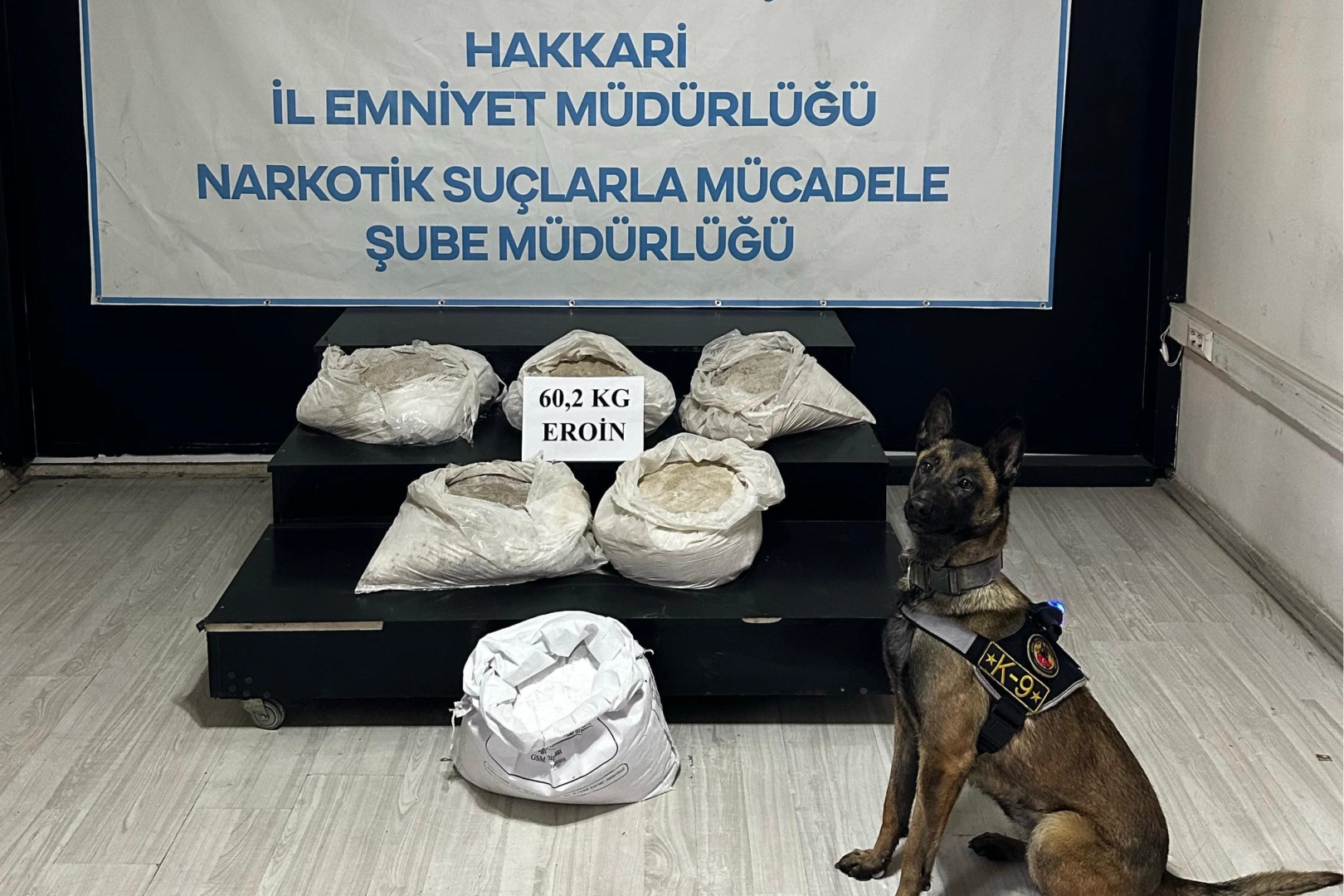 Hakkari'nin Yüksekova ilçesinde buğday nişastası yüklü çuvallar içerisinde 60 kilo 200 gram eroin maddesi ele geçirildi. Hakkari İl Emniyet Müdürlüğü sosyal medya hesabında yapılan paylaşımda, "Uyuşturucu Madde İmal ve Ticaretini" önlemek amacıyla yürütülen çalışmaların devam ettiği belirtildi. Açıklamada, "Yapılan çalışmalarda; Yüksekova ilçesinde durumundan şüphelenilen bir çekici ve dorse üzerinde yapılan aramada; dorse içerisinde bulunan toplam ağırlığı 25 ton gelen bin adet buğday nişastası yüklü çuvallar içerisinde 5 adet çuvala zulalanmış halde toplam ağırlığı 60 kilo 200 gram gelen eroin maddesi ele geçirilmiştir. Bahse konu aracın sürücüsü olan şüpheli şahıs ile ilgili gerekli adli tahkikat devam etmektedir" ifadelerine yer verildi.