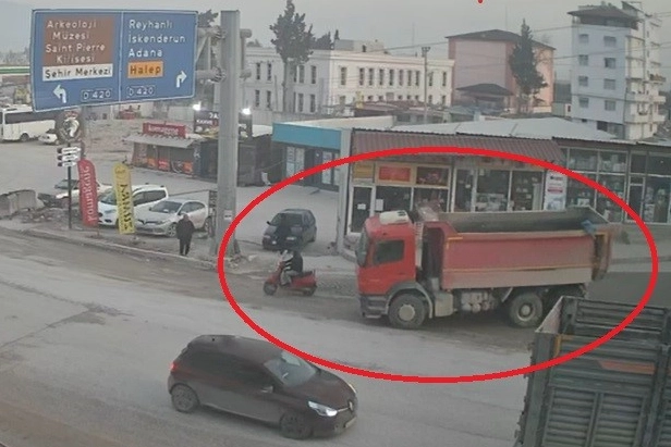 Hatay’da hafriyat kamyonununun altında kalan motosiklet sürücüsünün öldüğü kaza anı saniye saniye kameraya yansıdı.Kaza, Antakya ilçesi Narlıca Mahallesi’nde yaşandı. Trafikte seyir halde olan Hüseyin İlhanlı idaresindeki motosiklet, kavşakta R.T. yönetimindeki kamyonun altında kaldı. Kazada kamyonun altında ezilen motosiklet sürücüsü İlhanlı, hayatını kaybetti. Motosiklet sürücüsünün kamyonun altında kalarak can verdiği anlar saniye saniye güvenlik kamerasına yansıdı. Kazayı gören vatandaşları 112 Acil Çağrı Merkezi’ne bildirilmesi üzerine olay yerine polis ve ambulans ekipleri sevk edildi. Cenaze aracı, ölen motosiklet sürücüsünün cansız bedeni alarak morga kalırdı. Polis kazayla ilgili inceleme başlattı.