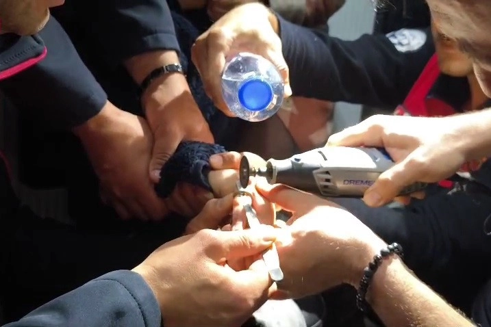 İhbarın ardından vakit kaybetmeden harekete geçen itfaiye personeli, çocuğun parmağında ciddi bir baskı oluşturan cismi inceledi. Özel kesici aletlerin kullanıldığı müdahalede, çocuğun parmağına zarar gelmemesi için azami dikkat gösterildi. Teknik ekipmanlarla gerçekleştirilen bu hassas işlem sırasında, metal halkanın kontrollü bir biçimde esnetilmesi ve kesilmesi sağlandı.