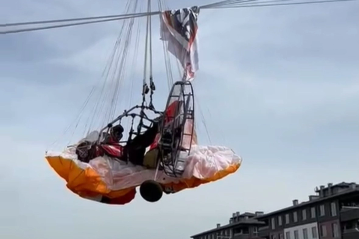 Düzce’de bir belediye başkan adayının reklamını gökyüzünde yapan paramotor sürücüsü, iniş esnasında elektrik tellerine takıldı. Meydana gelen olayda sürücü burnu bile kanamadan kurtulurken, bölgenin elektriği kesildi. Olay, Arapçiftliği Mahallesi'nde meydana geldi. Edinilen bilgilere göre, Düzce’de bir belediye başkan adayının afişlerini gökyüzünde tanıtan B.E. idaresindeki paramotor, iniş yaptığı esnada elektrik tellerine takıldı. Meydana gelen kazada paramotor sürücüsü B.E. şans eseri yara almadan kurtuldu. Kaza sebebiyle bölgede elektrikler kesilirken, oalyla ilgili soruşturma başlatıldı.