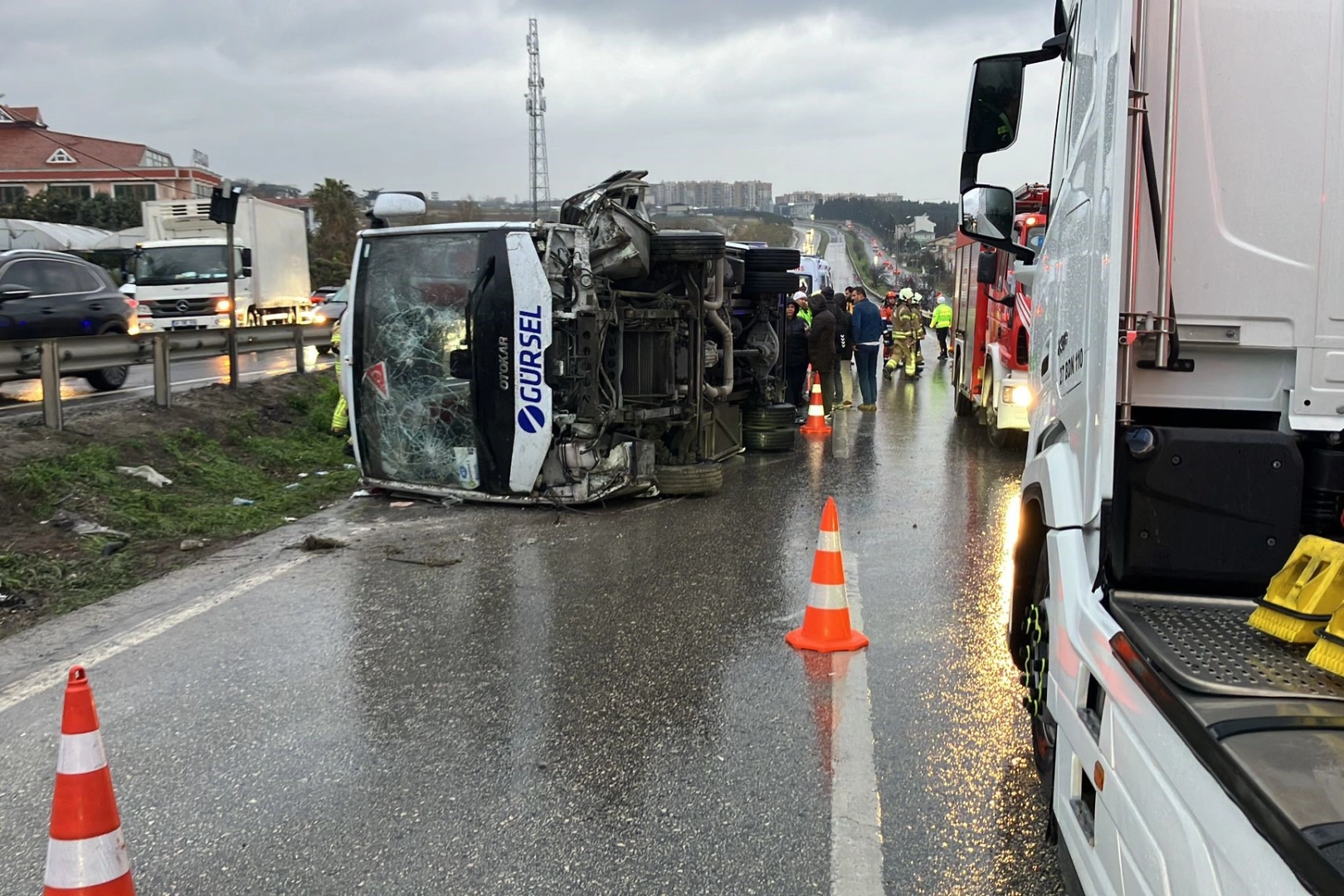 Kaza, akşam saatlerinde E-5 Büyükçekmece Güzelce mevki Beylikdüzü istikametinde meydana geldi. Edinilen bilgiye göre, Beylikdüzü istikametine seyir halinde olan servis minibüsü sürücüsü, yağış nedeniyle kayganlaşan yolda, direksiyon hakimiyetini kaybetti. Temizlik personelini taşıyan araç kontrolden çıkarak devrildi.