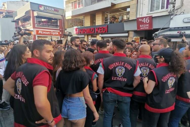 İzmir Valiliği tarafından yasaklanmasına rağmen eylem yapmak isteyen LGBT üyelerine polis müdahalede bulundu. Tüm ikazlara rağmen yürüyüşü gerçekleştirmek isteyen LGBT üyesi 50’nin üzerinde kişi gözaltına alındı. İzmir Valiliği, geçtiğimiz cuma günü LGBTİ dernekleri, benzeri oluşumlar ve gruplar tarafından gerçekleştirilmek istenen etkinliklerin genel ahlaka aykırı olduğunu ve provokatif olaylara sebep olabileceğini, olası şiddet ve terör olaylarının önüne geçilmesi amacıyla 2 gün boyunca toplantı ve gösteri yürüyüşlerinin yasaklandığını duyurmuştu. Valilik kararına rağmen LBGT üyeleri, eylem yapmak amacıyla bugün saat 17.45’te Alsancak Semti Kıbrıs Şehitleri Caddesi’nde bir araya geldi. Polis ekipleri caddeye çıkan tüm sokakları barikatlarla kapattı. Çevik Kuvvet ekipleri ve asayiş ekiplerin de katılımıyla geniş çaplı önlemler alınırken, bölgeye TOMA’da sevk edildi. Caddede bekleme yapmamaları ve dağılmaları konusunda polis ekiplerince yapılan tüm ikazlara aldırış etmeyen LGBT üyelerine müdahalede bulunuldu. Polis ekiplerince uyarılara aldırış etmeyen 50’nin üzerinde LGBT üyesi gözaltına alınarak emniyete götürüldü.