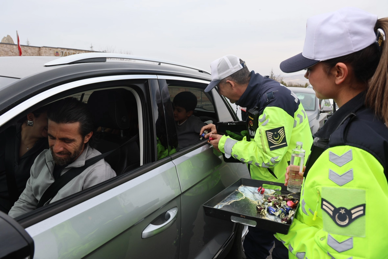 Bayram dolayısıyla Nevşehir'in Avanos ilçesine bağlı Çavuşin köyündeki jandarma uygulama noktasında durdurulan sürücüler, şeker ve kolonya ile karşılanarak bayramları kutlandı. Kapadokya’nın önemli giriş noktalarından birinde gerçekleştirilen uygulamada jandarma ekipleri, trafik kontrollerinin yanı sıra sürücülere ve yolculara iyi yol dileklerinde bulundu. Ekiplerin güler yüzlü yaklaşımı ve ikramları, özellikle bölgeyi ilk kez ziyaret eden turistler tarafından memnuniyetle karşılandı. Uygulama noktasında durdurulan sürücülerden Ömer Balkan, "Uygulama süper olmuş. Tebrik ediyorum. Her yönden dört dörtlük bir uygulama olmuş" dedi.