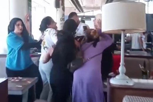 Kadınların birbirlerine bardak fırlattığı kavgada, bir kişi vücuduna isabet eden cam parçasıyla yaralandı. O anlar çevredeki vatandaşlar tarafından cep telefonuyla görüntülendi. Kadınlar olay yerine gelen güvenlik görevlilerince güçlükle ayırıldı.