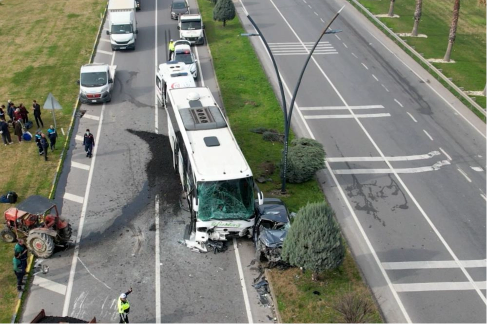 Manisa'nın Yunusemre ilçesinde 3 araçlı zincirleme kazada 5 kişi yaralanırken, ortalık savaş alanına döndü.Kaza, saat 11.30 sıralarında İzmir-Manisa çevre yolu Saat Kulesi kavşağı Menemen Köprüsü girişinde meydana geldi. Edinilen bilgiye göre Batı Çevre Yolu'nda Akhisar yönüne seyreden D.K. (72) idaresindeki 16 AFP 130 plakalı otomobil, aynı yönde sağ şeritte ilerleyen M.Y. (48) yönetimindeki 45 ET 318 plakalı asfalt atığı yüklü traktöre çarptı. Çarpmanın etkisiyle savrularak sol şeride geçen otomobile, İ.E. (52) idaresindeki 10 HF 160 plakalı Uludağ firmasına ait İzmir-İstanbul seferini yapan yolcu otobüs çarptı. Zincirleme kazada araçlarda ağır hasar meydana gelirken ihbar üzerine bölgeye çok sayıda ambulans polis ve itfaiye ekibi sevk edildi. Kazada traktör sürücüsü M.Y., otomobil sürücüsü D.K., otomobilde yolcu olarak bulunan N.K., otobüste görevli muavinler E.B. (20) ve K.Ş. (26) yaralandı. Yaralılar ambulansla hastanelere kaldırılarak tedavi altına alındı. Otobüste kazadan yara almadan kurtulan 11 yolcu ise başka bir otobüse bindirilerek yolculuklarına devam etti.Yaralıların durumlarının iyi olduğu öğrenilirken kazayla ilgili soruşturma başlatıldı.