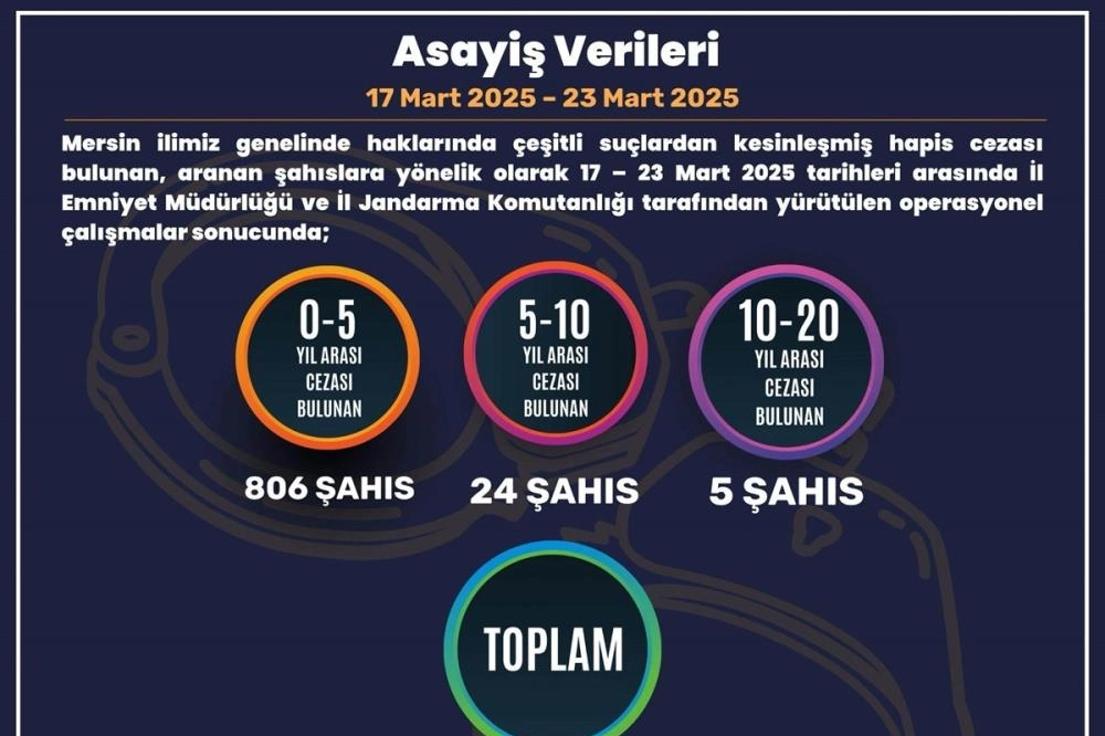 Mersin'de son bir hafta içerisinde gerçekleştirilen çalışmalarda, çeşitli suçlardan haklarında kesinleşmiş hapis cezası ile aranan 835 kişinin yakalandığı bildirildi.Mersin Valiliğinden yapılan açıklamaya göre, Güvenlik ve Asayiş Değerlendirme Toplantısı, Vali Atilla Toros başkanlığında yapıldı. Toplantıda, il genelinde güvenlik ve asayiş konularında yerine getirilen çalışmalar, alınan tedbirler, suç ve suçlulara karşı gerçekleştirilen operasyonlar ve ilgili diğer hususlar ele alındı. Mersin’in huzuru ve güvenliğini daim kılmak için emniyet, jandarma ve sahil güvenlik birimlerinin gece gündüz çalışmaya devam ettiği kaydedildi.