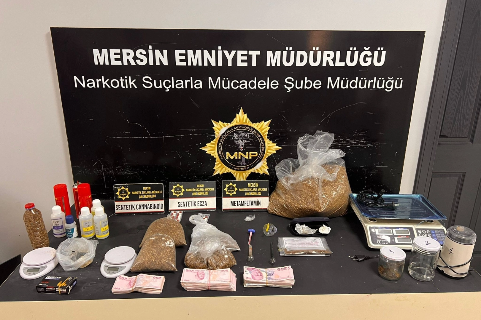Adreslerde yapılan aramalarda 701 gram sentetik kannabinoid, 3 kilo 250 gram tütün, kannabinoid yapımında kullanılan kimyasal maddeler, çok miktarda metamfetamin, A/M ve sentetik ecza maddesi, 3 hassas terazi ile çeşitli uyuşturucu kullanım aparatları ele geçirildi.