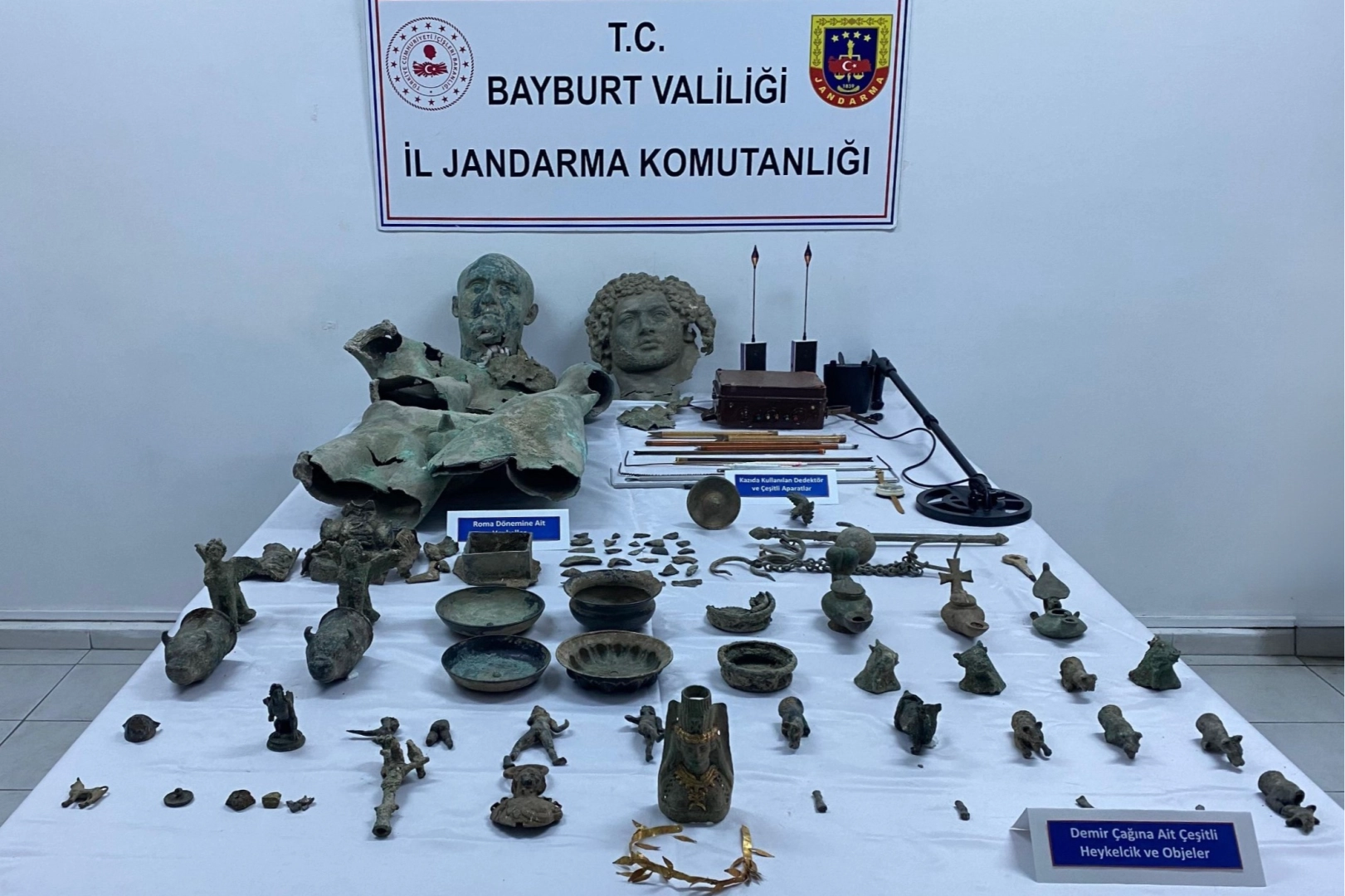 Bayburt İl Jandarma Komutanlığı tarafından yürütülen istihbari çalışmalar neticesinde, izinsiz kazı sonucu elde edilen tarihi eserlerin yasa dışı şekilde ticaretinin yapıldığı tespit edildi. Soruşturma kapsamında şüphelilerin kimlikleri ve adresleri belirlendi. Belirlenen adreslere yönelik Bayburt ve Gümüşhane'de gerçekleştirilen eş zamanlı operasyonlarda, şüpheliler U.Ç., E.Ç., E.Y., İ.Ç. ve T.A.'ya ait evlerde ve araçlarda yapılan aramalarda, 156 adet heykel, heykelcik ve çeşitli objeler ile tarihi eser aramada kullanılan dedektörler ele geçirildi. Bayburt Müze Müdürlüğünce yapılan incelemelerde, ele geçirilen objelerin Orta Çağ, Demir Çağı ve Roma Dönemi'ne ait olduğu belirlendi. Operasyon sonucu gözaltına alınan 5 şüpheliden 4'ü ifadelerinin ardından serbest bırakılırken, bir şüpheli çıkarıldığı mahkemece adli kontrol şartıyla serbest bırakıldı. Bayburt İl Jandarma Komutanlığı, kültürel mirasın korunmasına yönelik izinsiz kazı ve tarihi eser kaçakçılığıyla mücadele çalışmalarının kararlılıkla süreceğini bildirdi
