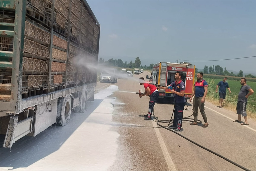 Osmaniye'nin Sumbas ilçesinde, canlı tavuk yüklü tırın dorsesinde çıkan yangın itfaiye ekiplerince söndürüldü.