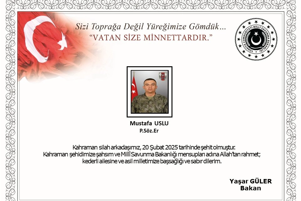 Bakanlığın açıklamasında şu ifadelere yer verildi: "Pençe-Kilit operasyonu bölgesinde, 20 Şubat 2025 tarihinde, bölücü terör örgütü mensupları ile çıkan çatışmada kahraman silah arkadaşımız Piyade Sözleşmeli Er Mustafa Uslu şehit olmuştur. Bizleri derin bir acı ve üzüntüye boğan bu olayda hayatını kaybeden aziz şehidimize Allah’tan rahmet, kederli ailesine, Türk Silahlı Kuvvetleri ile asil milletimize başsağlığı ve sabır dileriz.