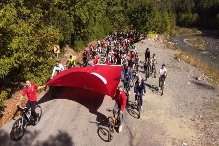 Türk bayrağı taşıyan öğrencilerin bisikletleriyle pedal çevirdiği tur, Belemedik Tabiat Parkı'nda son buldu.