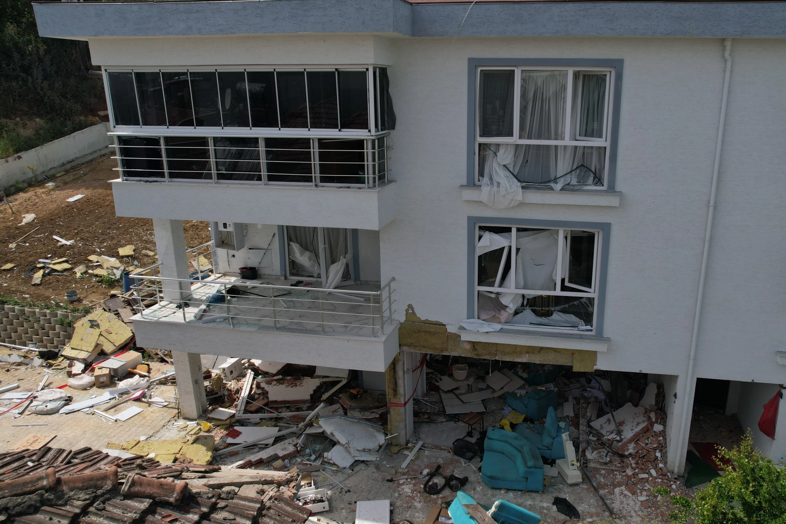 Neredeyse kullanılamaz hale gelen 3 katlı bina ise havadan dron ile görüntülenirken, facianın büyüklüğü gözler önüne serildi.