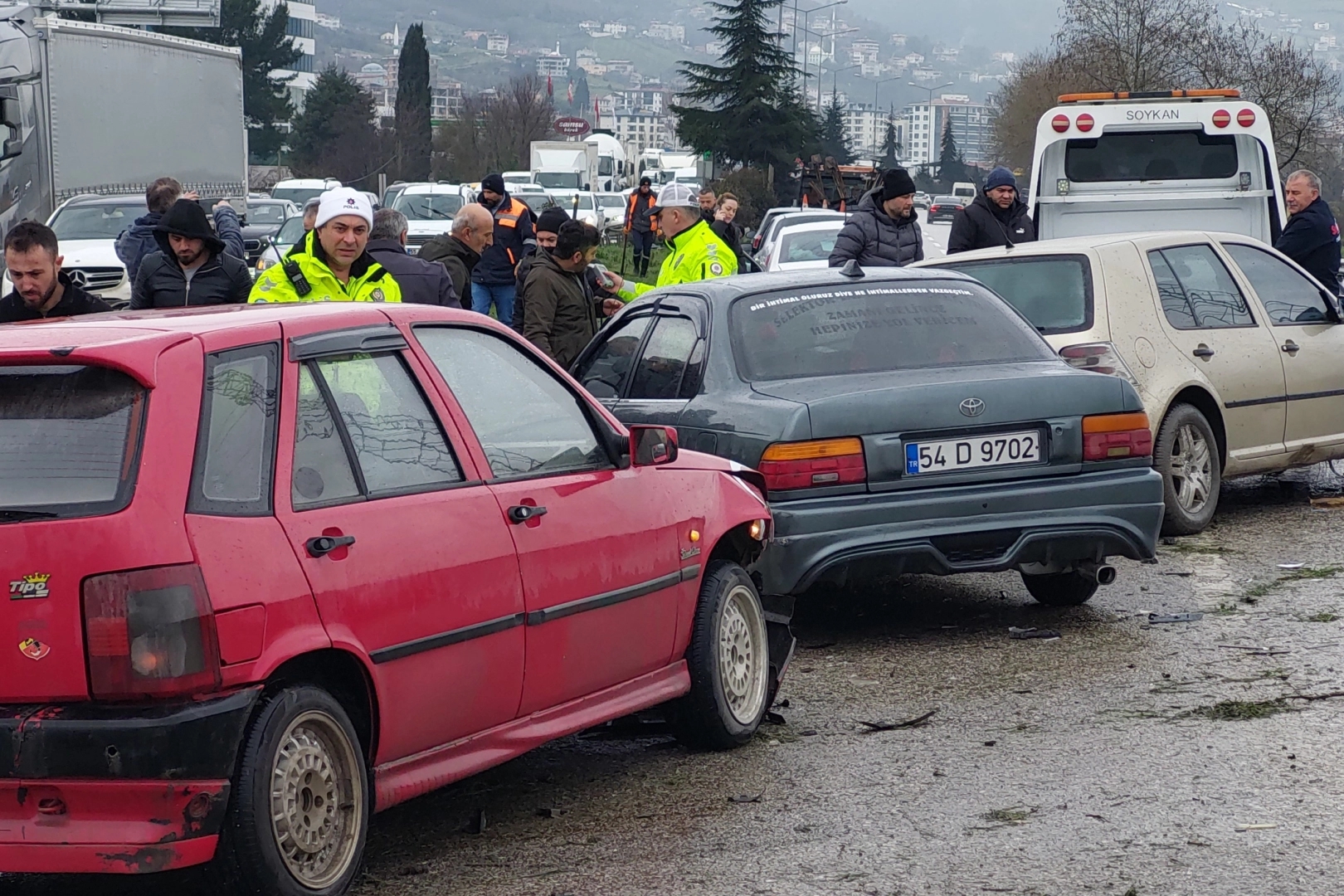 Samsun’un Canik ilçesinde, 9 aracın karıştığı zincirleme trafik kazasında maddi hasar meydana geldi. 200 Evler mevkisi çevre yolu üzerinde saat 09.00 sıralarında meydana gelen kazada, şans eseri yaralanan olmadı. Yağmur nedeniyle kayarak bariyere çarpan 2 aracın ardından, arkadan gelen araçlar peş peşe kazaya karıştı.