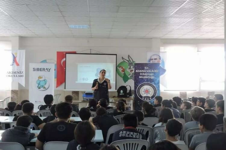 Adana İl Emniyet Müdürlüğü’ne bağlı Siber Suçlarla Mücadele Şube Müdürlüğü ekipleri, Siberay Projesi eğitim çalışmalarını sürdürüyor. Ekipler Seyhan İlçesi Özel Akdeniz Ortaokulunda öğrencilerle bir araya geldi.