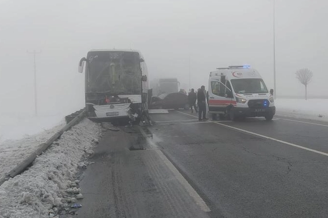 Sivas'ın Gemerek ilçesinde sisli hava nedeniyle aralarında yolcu otobüsünün bulunduğu 4 aracın karıştığı zincirleme trafik kazasında 7 kişi yaralandı.Edinilen bilgilere göre kaza, Gemerek ilçesi Etlik Kavşağı'nda meydana geldi. M.S. idaresindeki 52 LH 500 plakalı tır, kırmızı ışıkta bekleyen Y.Y. idaresindeki 68 EZ 777 plakalı tıra çarptı. A.A. idaresindeki 58 ADZ 971 plakalı Mercedes marka yolcu otobüsü, kırmızı ışıkta bekleyen tıra arkadan çarptı. Kazanın devamında ise Y.P. yönetimindeki 34 TD 4643 plakalı otomobil, yolcu otobüsüne arkadan çarptı. Meydana gelen zincirleme kazada Y.P., A.P., A.A., M.E., S.E., Z.E. ve N.E. yaralandı. İhbar üzerine olay yerine sağlık, itfaiye ve polis ekipleri sevk edildi. Yaralılar ambulanslarla Gemerek Devlet Hastanesi'ne kaldırılarak tedavi altına alındı. Kazayla ilgili inceleme başlatıldı.
