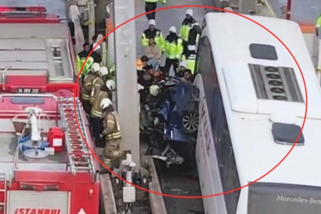 İstanbul Silivri Kuzey Marmara Otoyolu Kınalı gişeler mevki İstanbul istikametinde seyir halinde olan yolcu otobüsüyle otomobil çarpıştı. Çarpışmanın etkisiyle yolcu otobüsü ve otomobil gişelerde sıkıştı. Otomobil sıkışan yaralıları kurtarma çalışmaları sürerken, olay yerine dronla görüntülendi.
