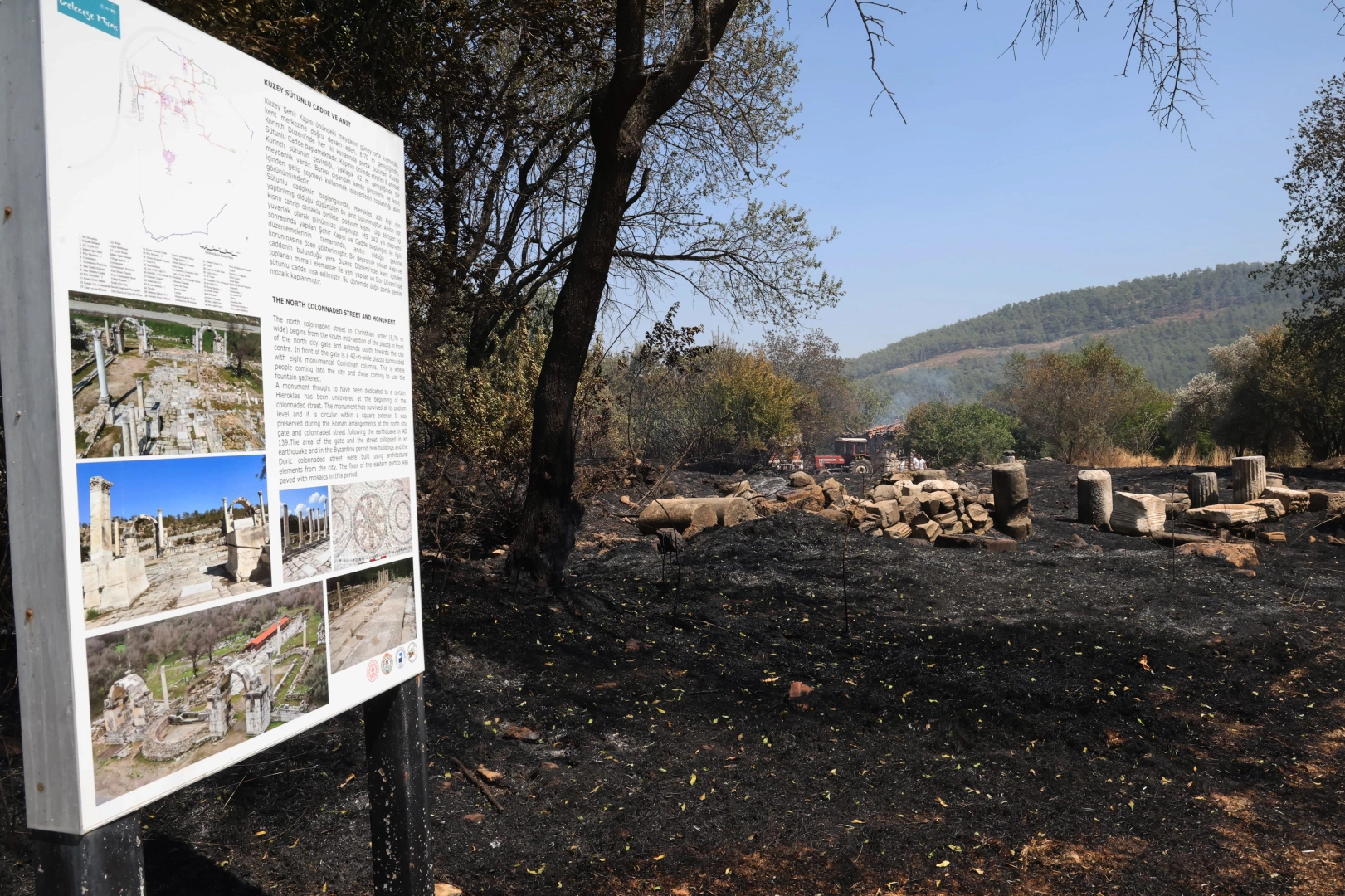Muğla Yatağan’daki Stratonikeia antik kent çevresinde çıkan otluk yangını, yüzlerce yıllık meyve ağaçlarına zarar verdi. Havadan ve karadan müdahalelerle yangın kontrol altına alındı.