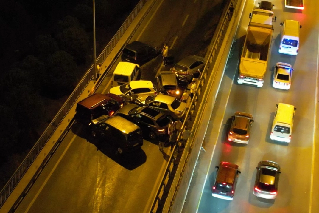 İstanbul Sultanbeyli'de 15 aracın birbirine girdiği zincirleme kazada 5 kişi yaralandı. Kaza, Sultanbeyli ilçesi yan yolda saat 18.30 sıralarında meydana geldi. Yola dökülen yağ nedeniyle araçların kayması sonucu 15 araç kazaya karıştı. Kazada 5 kişi yaralandı. Olay yerine polis ve sağlık ekipleri sevk edildi. Yaralılar, sağlık ekipleri tarafından hastaneye sevk edildi. Polis, kaza sonrası güvenlik önlemi alırken kazaya karışan araçlar havadan görüntülendi. Dündar Açıkgöz isimli vatandaş, "Araçtan yağ dökülmüş yola. Öndekiler kazayı görüyor. Buradakiler de kayıyorlar birbirlerine giriyorlar. Yaklaşık 15 araç var” dedi. Kazayla ilgili inceleme başlatıldı.