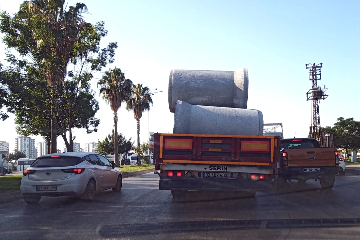 Bugün Adana'da römork plakası 33 AKZ 403 olan bir tırla tonlarca ağırlığındaki beton boruların gerekli bağlama önlemi alınmadan taşınması, trafikte büyük bir tehlike oluşturdu.