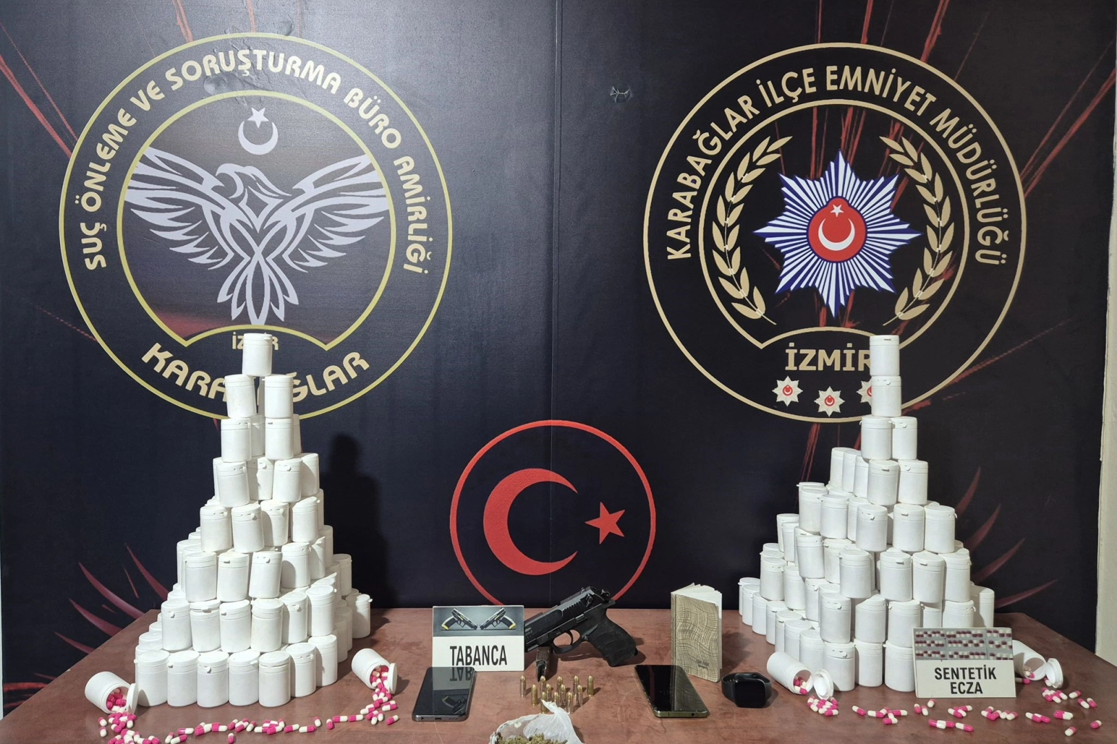 Karabağlar İlçe Emniyet Müdürlüğü Suç Önleme ve Soruşturma Büro Amirliği ekipleri, ilçede uyuşturucu madde kullanımı ve ticaretine yönelik yürüttükleri çalışmalarda A.K. (44) ve M.A.’nın (24) birlikte uyuşturucu sattığını ve sattıkları maddeleri Konak ilçesindeki bir ikamette sakladığını tespit etti. Adreslere eş zamanlı operasyon düzenleyen polis ekipleri, şüphelilerin adreslerinde yaptıkları aramada, 14 bin 642 adet uyuşturucu hap, 10.52 gram esrar ve 1 adet ruhsatsız tabanca ele geçirdi. Gözaltına alınan sevgililer, emniyetteki işlemlerin ardından çıkarıldıkları mahkemece tutuklandı.