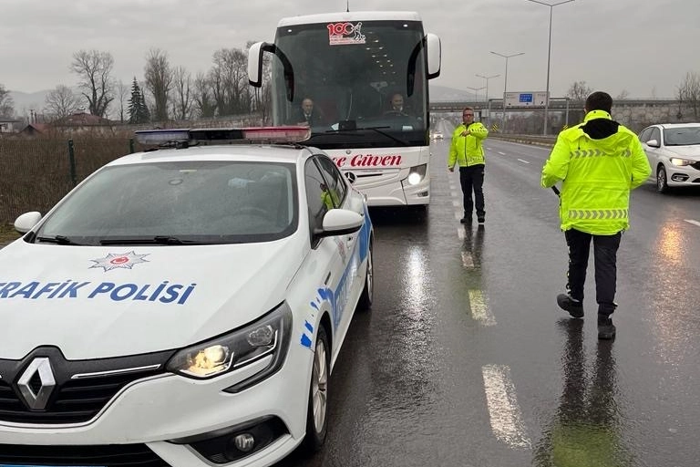Düzce İl Emniyet Müdürlüğü Bölge Trafik Müdürlüğü’ne bağlı trafik ekipleri otoyol üzerinde şehirlerarası otobüslere yönelik denetimlerini sıklaştırdı. Vatandaşın can, mal ve trafiğin huzuru için yapılan denetimlerde 28 otobüs denetlendi. Bu otobüslerin bazılarına 28 bin 585 lira para cezası kesildi. Ayrıca, trafik güvenliğini tehlikeye sokacak şekilde yolcu indirdiği tespit edilen bir otobüs şoförüne cezai işlem uygulanırken, ehliyetine el konuldu.