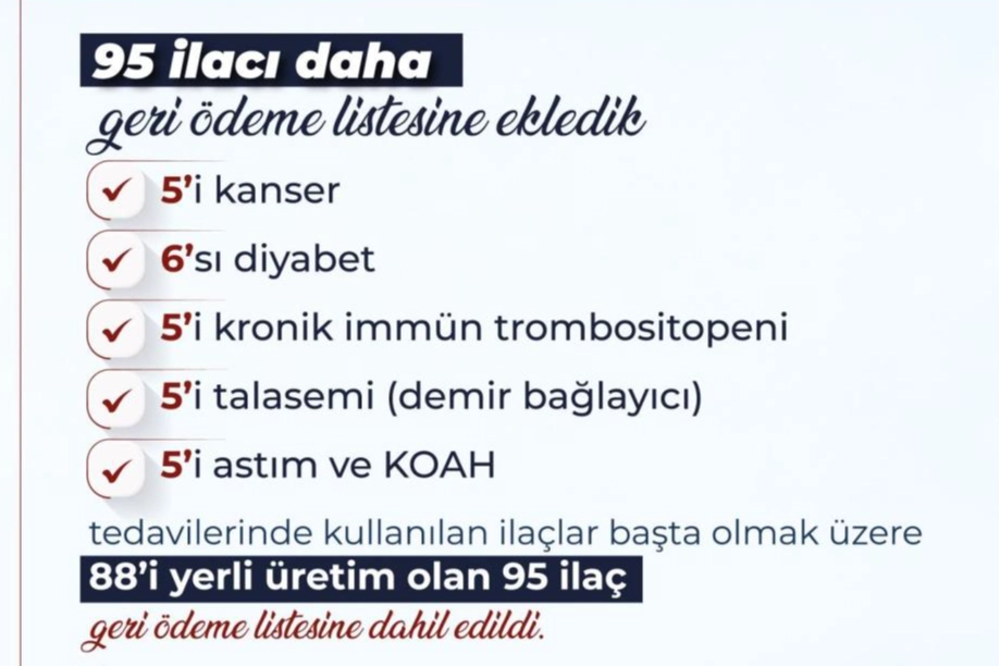 Bakan Işıkhan X hesabından yaptığı paylaşımda SGK düzenlemesi kapsamında 88’i yerli üretim olmak üzere 95 ilacın daha geri ödeme listesine alındığını açıkladı. Işıkhan paylaşımında, "5’i kanser, 6’sı diyabet, 5’i kronik immün trombositopeni, 5’i talasemi, 5’i astım ve KOAH tedavilerinde kullanılan ilaçlar başta olmak üzere 88’i yerli üretim olan 95 ilaç geri ödeme listesine dahil edildi" ifadelerine yer verdi.