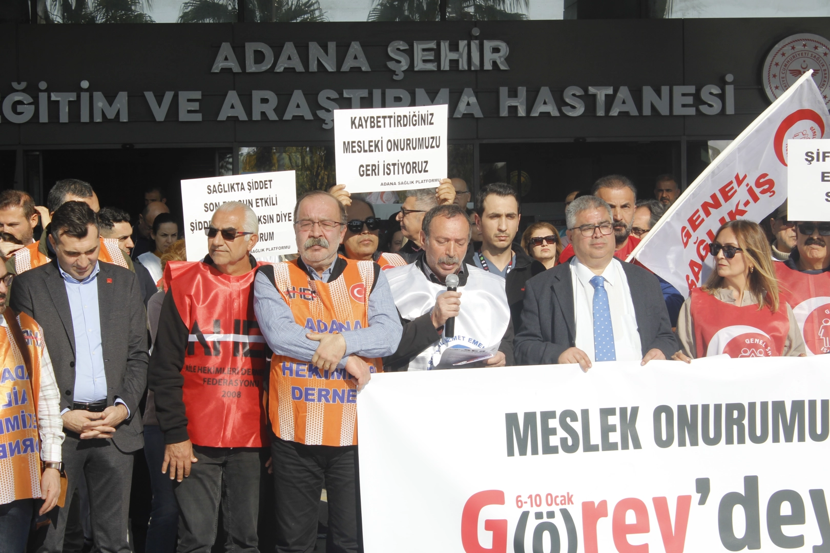 "Sağlık emekçileri hakları için alanlarda"Sağlık ve Sosyal Emekçiler Sendikası Adana Şube Başkanı Erol Eren, “Bugün sağlık emek, meslek örgütleri ile birlikte sahada canla başla çalışan hekim, ebe, hemşire ve sağlık emekçileri olarak 2. basamak ve 3. basamakta iş bıraktık taleplerimiz gerçekleşinceye kadar, yönetmeliği geri çekilene kadar eylemlerimiz devam edecektir” dedi ve talepleri şu şekilde sıraladı: