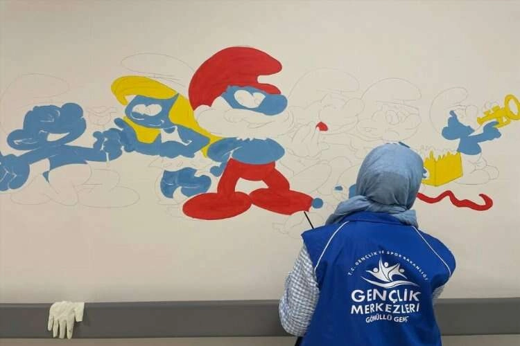 Resim öğretmeni Harzemhan Sonsuz'un da yer aldığı 10 gönüllü, Dörtyol Devlet Hastanesinin Çocuk Hastalıkları Servisi'nde tedavi görenler ile muayeneye gelen minikler için poliklinik duvarlarına çizgi film karakterlerinin resimlerini yaptı.