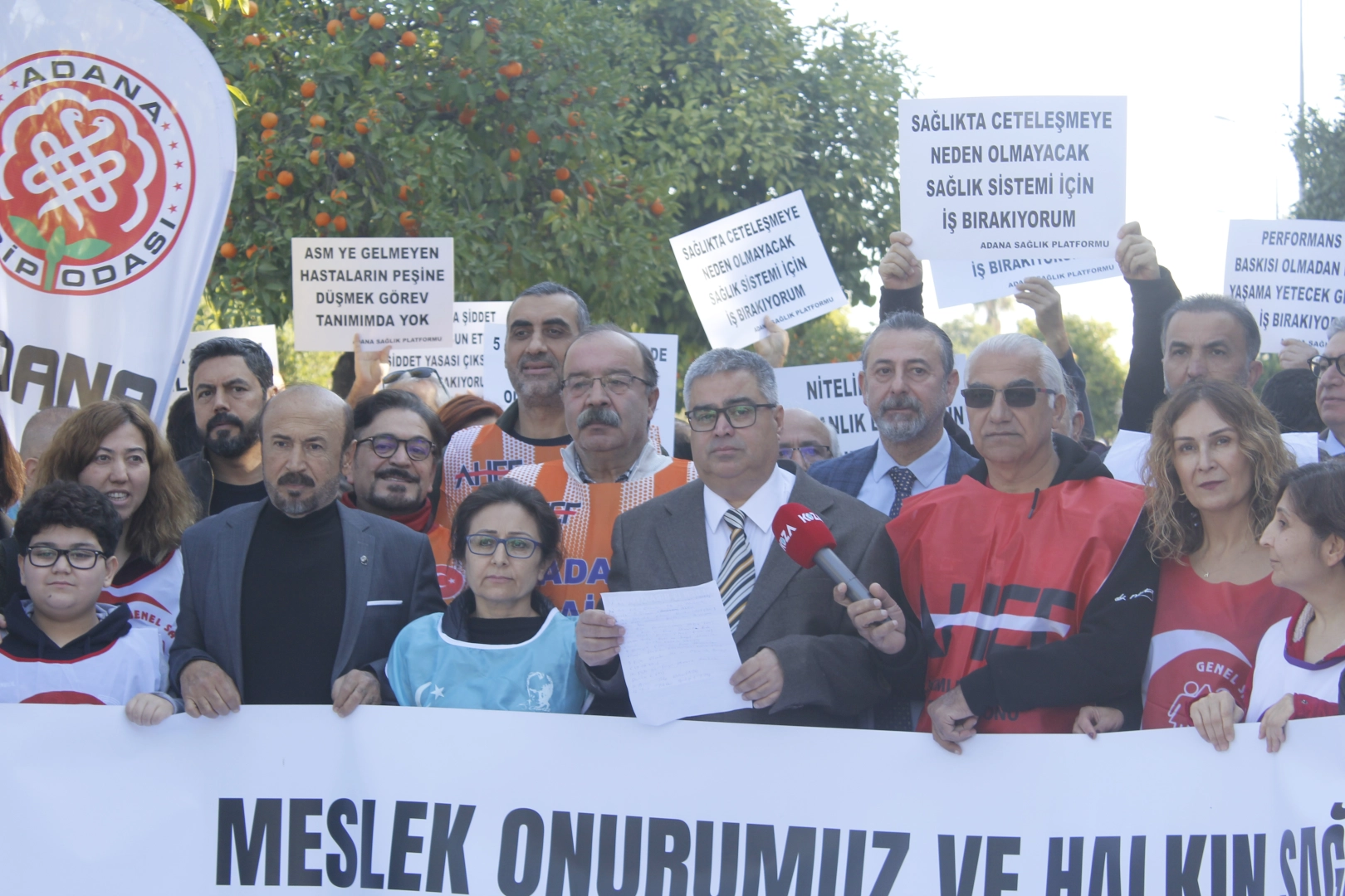 Adana Tabip Odası Başkanı Uzm. Dr. Özden Polatöz, açıklamasında yönetmelikle hekimlerin reçete yazma yetkisinin kısıtlandığını ve gelir kesintilerinin mantıklı olmadığını belirtti: “Bugün sağlık emek meslek örgütleri ile birlikte sahada canla başla çalışan hekim, ebe, hemşire ve sağlık emekçileri olarak binlercemiz yeniden sağlık müdürlüklerinin önündeyiz. Üçüncü defa iş bırakıyoruz. Sağlık Bakanlığı’na sesleniyoruz. Halkın sağlığını korumak ve geliştirmek istiyor musunuz? Hekimlerin, ebe, hemşire ve sağlık emekçilerinin sorunlarını çözmek istiyor musunuz? Duyuyorsunuz biliyoruz. Ancak anlamıyorsunuz, ne yapacağınızı bilmiyorsunuz. Bu yönetmelikle hekimlerin yazdığı reçeteler baskı altın alınmakta ; antibiyotik, ağrı kesici ve mide ilaçları yazmamız kısıtlanmaktadır. Hastaların tıbbi durumu, ihtiyacı neyi gerektiriyorsa bizler o ilacı yazmakla yükümlüyüz. Hastasını tedavi etti diye hekimlerin, sağlık çalışanlarının gelirinin azaltmak hangi mantığa sığar? Soruyoruz! Yönetmelikle, Sorumlu olduğumuz nüfus içinden 6 ay ASM’ye başvurmayan kişiler için de gelirimiz kesiliyor. Hastalarımız verdiğimiz tedavi ve önerilerimizle sağlıklı olduysa bize neden başvursun? Yine soruyoruz: Hastasının sağlığını korudu diye hekimlerin, sağlık çalışanlarının gelirinin azaltmak hangi mantığa sığar.”