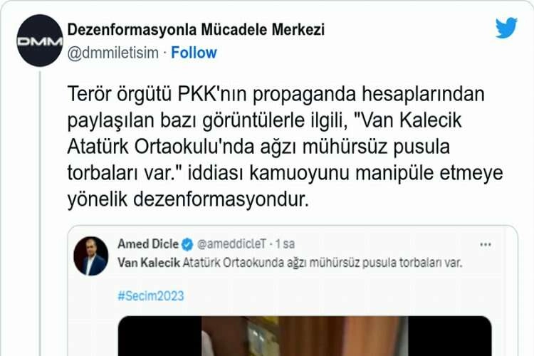Bu olaylara son olarak seçim gününde terör örgütlerine iltisaplı "Amed Dicle" adlı hesaptan bir paylaşım gerçekleştirildi. Cumhurbaşkanlığı İletişim Başkanlığı'na bağlı Dezenformasyonla Mücadele Merkezi "Amed Dicle" adlı hesaptan paylaşılan "Van Kalecik Atatürk Ortaokulu'nda ağzı mühürsüz pusula torbaları var." iddiasına karşı şu açıklamayı yaptı;