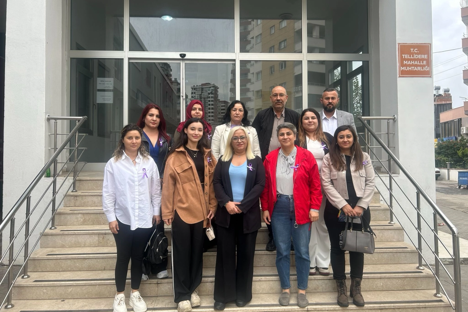 Katılımcılar, mor kurdele dağıtarak toplumu kadına yönelik şiddete karşı bilinçlendirmeyi hedefledi ve “Kadına Şiddete Hayır” mesajını vurguladı.
