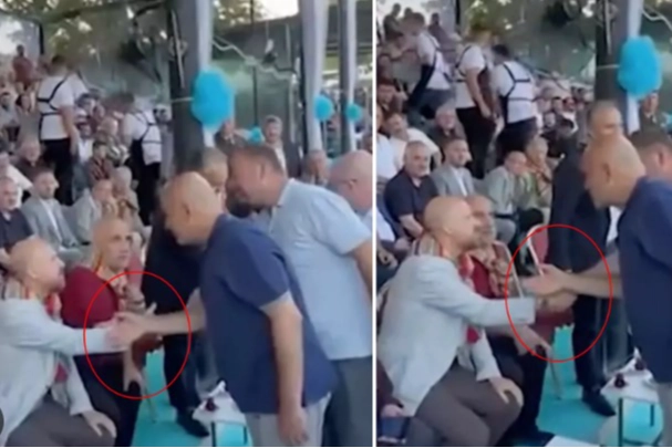 Alanda bulunan CHP'li ve İYİ Partili isimlerle tokalaşırken, babasının eski doktoru olan Turhan Çömez'in elini sıkmadı.Eli havada kala Çömez bir süre bekledikten sonra tepki olarak birkaç kez elini Bilal Erdoğan'ın yüzünün önünde salladı.