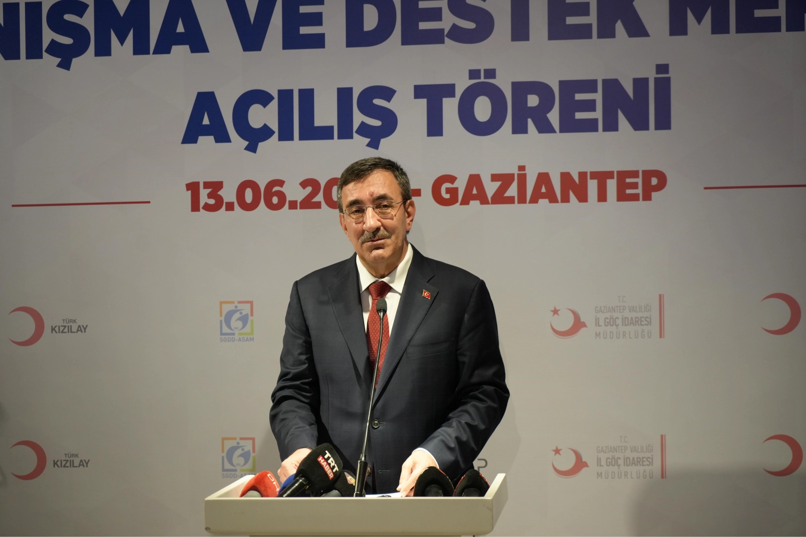 "SURİYELİLERİN YENİ OLUŞAN SURİYE'YE GÜVENLİ, ONURLU, GÖNÜLLÜ GERİ DÖNÜŞÜ BİZİM İÇİN ÇOK KIYMETLİ"Açılışı yapılan merkezin hayırlı olması temennisinde bulunan Cumhurbaşkanı Yardımcısı Cevdet Yılmaz, "Öncelikle Cumhurbaşkanımız Recep Tayyip Erdoğan'ın da size en derin sevgilerini, saygılarını, selamlarını iletmek istiyorum. Ülkemizde geçici koruma kapsamında bulunan Suriyelilerin yeni oluşan Suriye'ye güvenli, onurlu, gönüllü geri dönüşü bizim için çok kıymetli. Bugün açılışını yaptığımız bu merkez gerçekten çok önemli. Örnek teşkil edecek bir çalışma. Bir tarafında merkezi yönetim var, diğer tarafında yerel yönetim var. Bir diğer yandan Kızılay'ımız başta olmak üzere sivil toplum boyutu var. Dolayısıyla kamu, özel kesim, sivil toplum işbirliğine çok güzel bir örnek. Uluslararası tabii işbirliklerine de açık bir model. Bu model çalışmada emeği geçenleri konuşmamın hemen başında tebrik etmek istiyorum. Büyükşehir Belediye Başkanımıza Fatma hanıma, yine Kızılay Başkanımız Fatma hanıma şükranlarımı sunuyorum. Tabi valimize ve merkezi idare kuruluşlarımıza, Göç İdaresi Başkanlığımız başta olmak üzere çok çok teşekkür ediyorum. Burası gerçekten model bir çalışma ve birçok birim aynı mekanda hizmet verecekler. Gönüllü, onurlu, güvenli geri dönecek olan Suriyeli kardeşlerimiz buradan çok boyutlu bir hizmet alma imkanına sahip olmuş olacaklar. Bunun ben diğer illerimize de, bölgelerimize de örnek olacağını düşünüyorum" dedi.