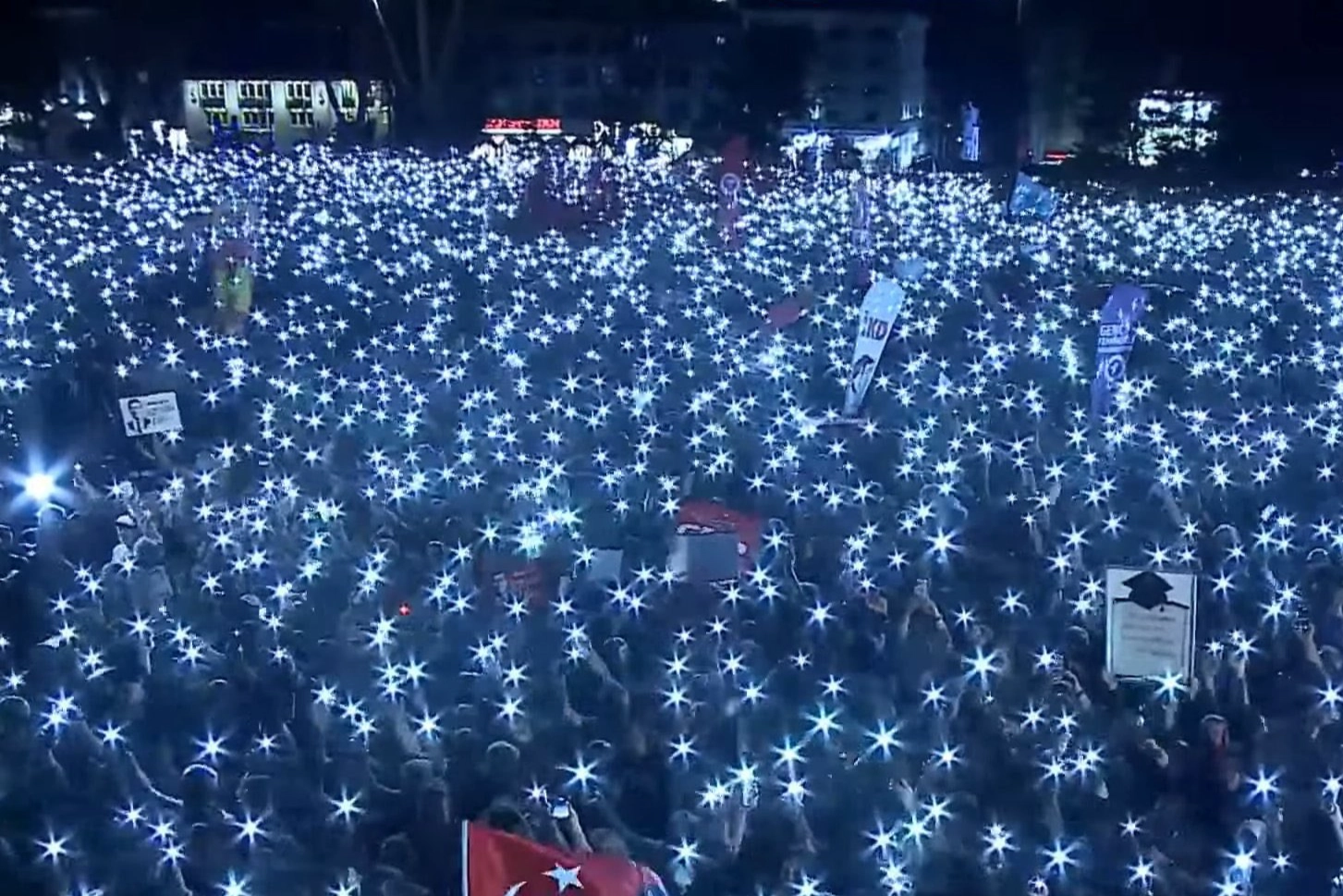 Özgür Özel’in çağrısıyla açılan telefon ışıkları eşliğinde, geçtiğimiz günlerde yaşamını yitiren sanatçı Volkan Konak’ın “Yiğidim Aslanım” şarkısı çalındı. Kalabalık hep bir ağızdan parçaya eşlik etti.