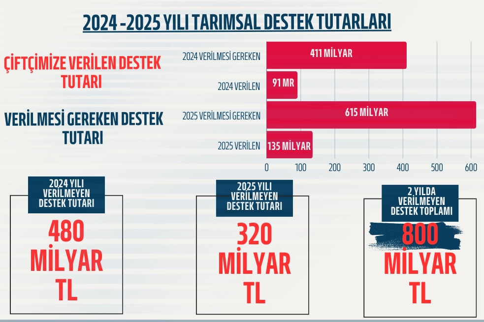Destekler YetersizÖmer Fethi Gürer, hükümetin çiftçilere yönelik verdiği desteklerin yetersiz kaldığını belirterek, 2025 yılı için belirlenen 135 milyar TL’lik desteğin, Tarım Kanunu’na göre olması gerekenin çok altında olduğunu söyledi. "Tarım Kanunu’nun 21. maddesine göre, milli gelirin %1’i kadar destek verilmesi gerekiyor. Bu da yaklaşık 615 milyar TL’ye denk geliyor. Ancak iktidar, bu kanuni yükümlülüğü yerine getirmeyerek çiftçilerin mağduriyetini artırıyor" diye konuştu.