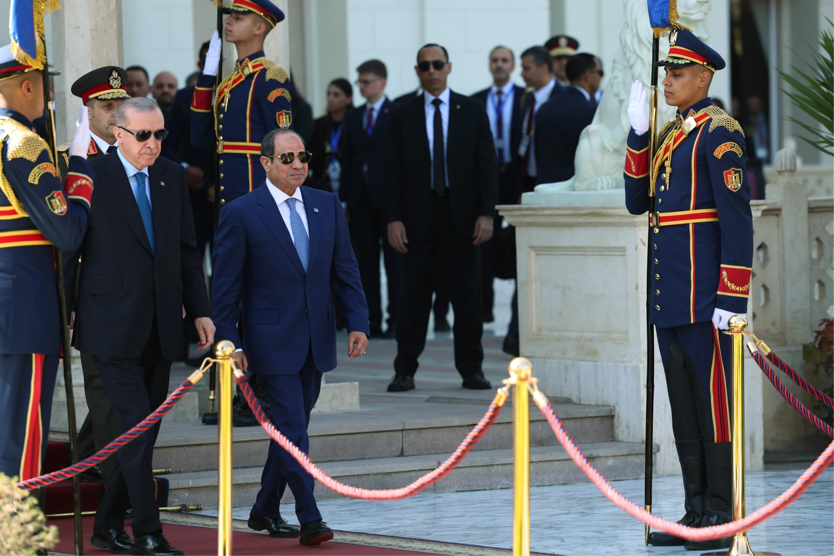 SARAYDA TOP ATIŞLARIYLA KARŞILAMAAl-İttihadiye Sarayı'na gelen Cumhurbaşkanı Erdoğan için burada resmi karşılama töreni düzenlendi. Saraya girişte top atışlarıyla başlayan törende iki ülkenin milli marşları okundu. Liderlerin tören kıtasını selamlamasının ve heyetlerin birbirine takdim edilmesinin ardından Cumhurbaşkanı Erdoğan ve Mısır Cumhurbaşkanı Sisi baş başa görüşmeye geçti. İkili görüşmenin ardından liderlerin heyetler arası görüşmelere başkanlık edeceği bildirildi.