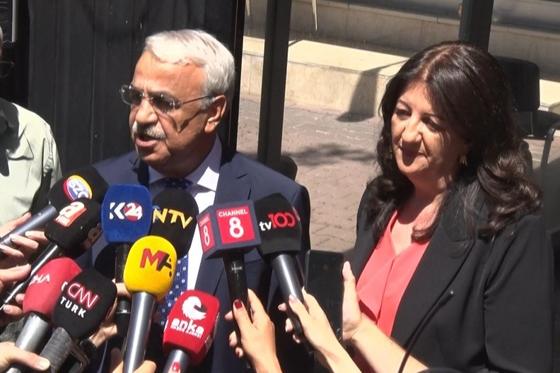 DEM Parti İmralı heyeti, Cumhurbaşkanı Recep Tayyip Erdoğan ile yapacağı görüşme öncesinde Genel Merkez'de Eş Genel Başkanları Tülay Hatimoğulları ve Tuncer Bakırhan ile bir araya geldi. Heyet dün İmralı'da bölücü terör örgütü elebaşı Abdullah Öcalan ile yaptığı görüşmeye ilişkin bilgilendirme yapmıştı, Cumhurbaşkanı Erdoğan'la yapılacak görüşmeye ilişkin de görüş alışverişinde bulunan heyet, Cumhurbaşkanı Erdoğan ile görüşmek için yola çıktı. Öncesinde ise basın mensuplarının sorularını İmralı heyetinden Pervin Buldan ile Mithat Sancar cevapladı.