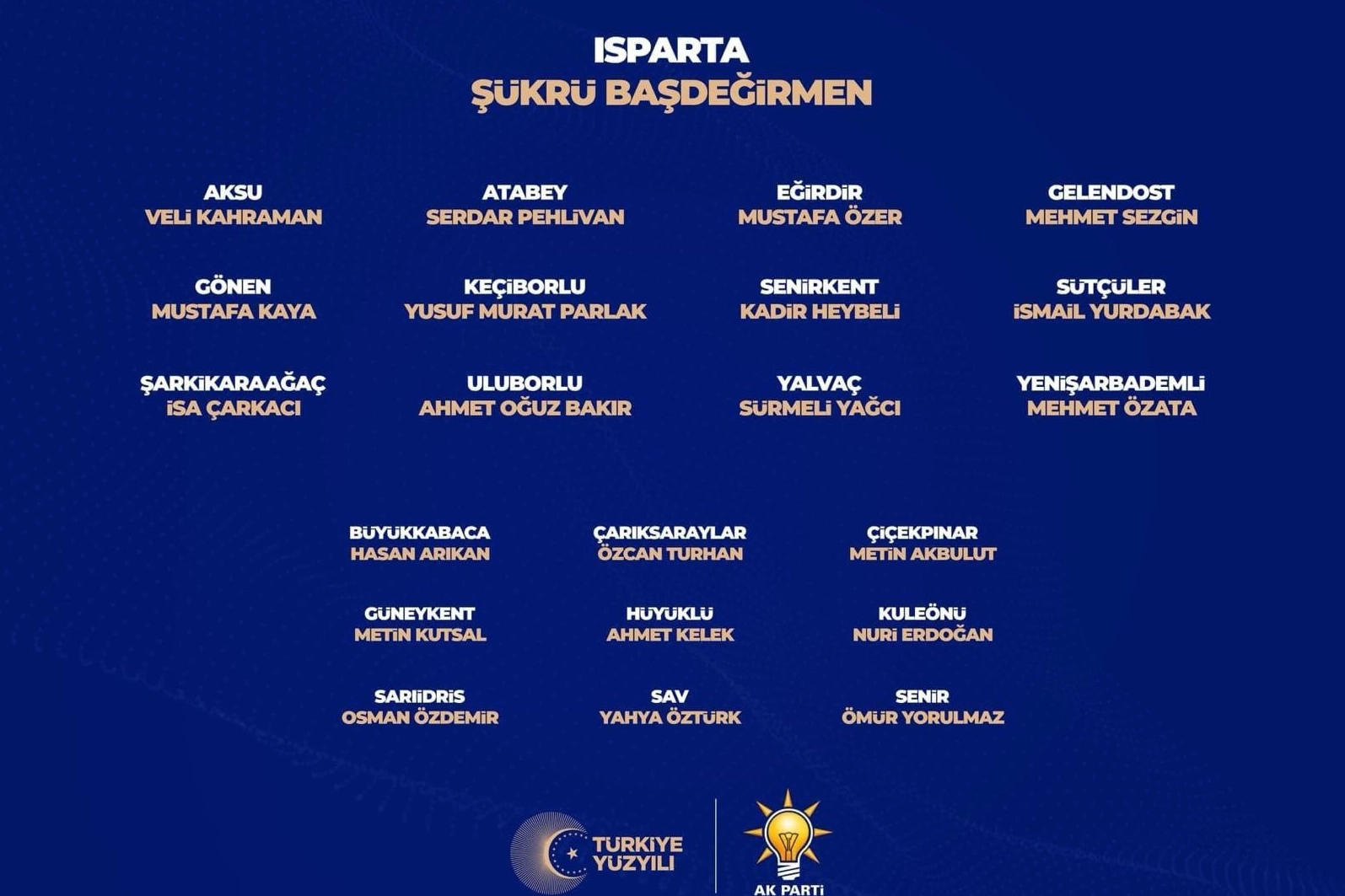 Isparta’da bulunan beldeler için ise AK Parti’den açıklanan adaylar; Senir Beldesi Ömür Yorulmaz, Sarıidris Beldesi Osman Özdemir, Büyükkabaca Beldesi Hasan Arıkan, Çarıksaraylar Beldesi Özcan Turhan, Çiçekpınar Beldesi Metin Akbulut, Hüyüklü Beldesi Ahmet Kelek, Kuleönü Beldesi Nuri Erdoğan, Sav Beldesi Yahya Öztürk ve Güneykent Beldesi için Metin