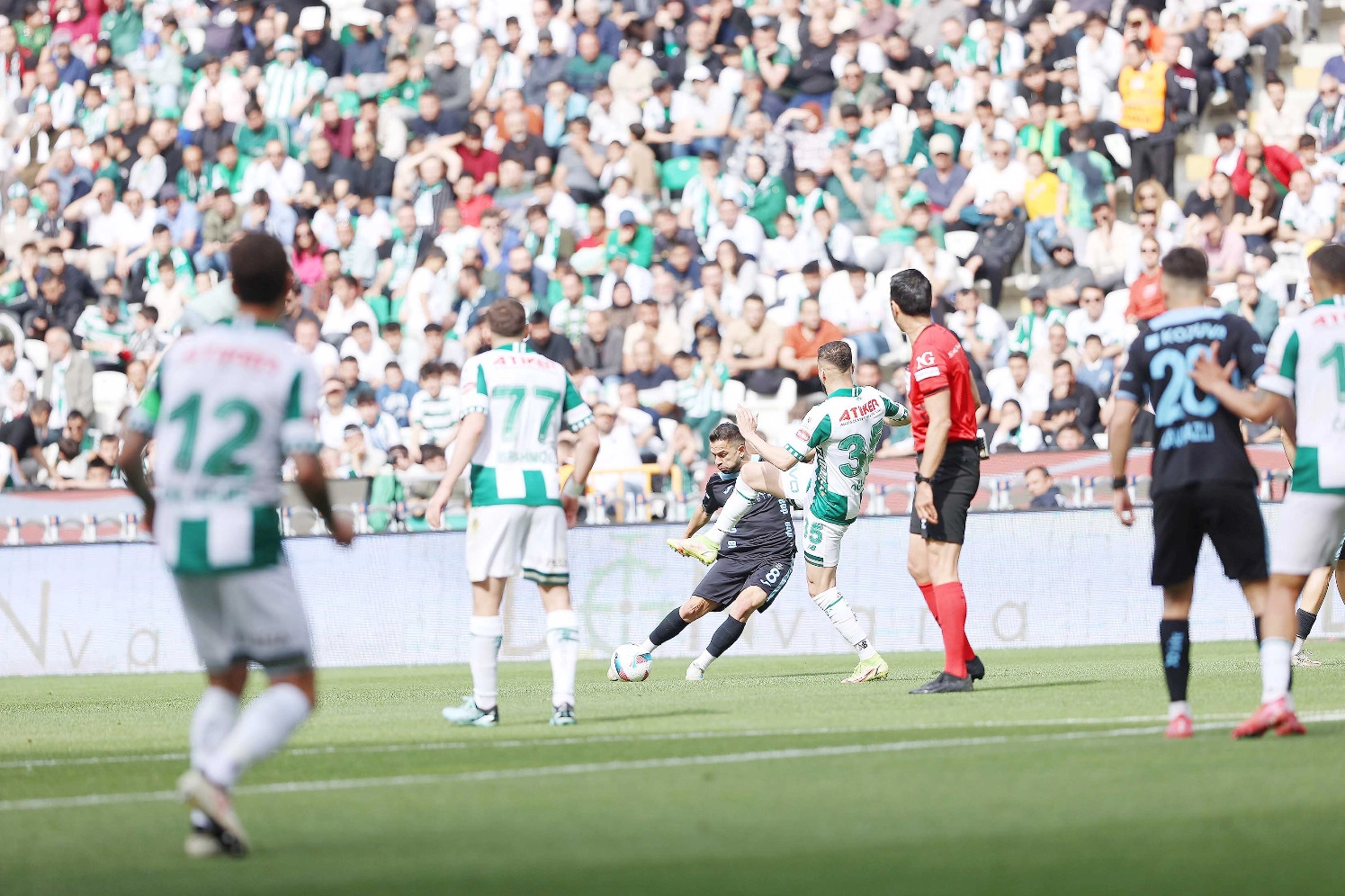 Matematiksel olarak ligden düşmesi kesinleşen Adana Demirspor, Süper Lig 33. Hafta maçında deplasmanda Konyaspor’a 3-1 mağlup oldu. Adana ekibi ilk yarıyı Salih Kavrazlı’nın 45+3. Dakikada bulduğu gol ile 1-0 önde kapatırken, Konya ekibi ikinci yarı 69 ve78. dakikalarda Bazoer, 90+4. dakikada ise Abdulsamet Burak’ın kendi kalesine attığı gol ile skoru 3-1’e getirip 3 puanı alan taraf oldu. Karşılaşmanın ilk yarısı Konyaspor’un etki oyunu dikkat çekerken, Adana ekibi savunmada hata yapmadı ve gole izin vermedi. Adana Demirspor hızlı hücumlarla rakip kalede gol aradı ve maçın 45+3’üncü dakikasında duran toptan bulduğu gol ile ilk yarıyı 1-0 önde kapattı. 38. dakikada Konya ekibi gole yaklaştı. Guilherme’nin ceza alanı dışı sol çaprazdan içeri ortasında, arka direkte bulunan Yusuf Erdoğan kafa vurdu, kaleci Murat Uğur iki hamlede kontrol etti. Rakip alan ön bölgede baskıyı artıran Konya ekibinin 38. dakikada gelişen atağında, Kramer sağdan hızla ilerleyip ceza alanına girdi. Tolga’nın karşıladığı Kramer, soldan geriden gelen Yusuf Erdoğan’a bıraktı. Yusuf penaltı noktası solundan gelişine sert vurdu, top üstten auta çıktı ve mutlak gol kaçmış oldu. Adana Demirspor 45+3. Dakikada ceza yayı önünden serbest vuruş kazandı. Atışı kullanan Salih Kavrazlı’nın sağ ayağıyla şık vuruşunda barajın üzerinden geçen meşin yuvarlak sol köşeden ağlarla buluştu: 0-1 Konyaspor beraberliği yakaladı. Karşılaşmanın 69. dakikasında Konyaspor’un soldan gelişen atağında Yusuf Erdoğan soldan ceza alanına girmeden içeri ortaladı, ön direkte bulunan Bazoer yükselip kafa vurup meşin yuvarlağı kalecinin üzerinden ağlarla buluşturdu: 1-1. Konyaspor soldan köşe vuruşu kazandı. 78. dakikada atışı kullanan Yusuf Erdoğan’ın ortasında savunmadan dönen topa ceza alanı içerisinde bulunan Bazoer, kaleyi karşıdan gören açıdan şık vuruşuyla topu sol köşeden ağlara gönderi: 2-1 Karşılaşmanın 90+4. dakikasında Adana ekibi çıkmaya çalışırken Konya ekibinden Pedrinho ceza yayına yakın yerden topu alarak içeri ortaladı. Adana ekibinden Abdulsamet Burak kalecisine geri pası vermek isterken top kaleciyi aştı ve ağlara gitti: 3-1. Bu aynı zamanda maçın da skoru oldu. STAD: Konya Büyükşehir HAKEMLER: Arda Kardeşler (xxx), Samet Çavuş (xxx), Abdullah Uğur Sarı (xxx) KONYASPOR: Deniz (xx), Uğurcan Yazğılı (xx) (Dk.46 Umut Nayır xx), Pedrinho (xx) (Dk.84 Jevtovic x), Yusuf Erdoğan (xxx), Prip (xx) (Dk.84 Boanjasevic x), Guilherme (xxx), Calusic (xxx), Bazoer (xxx), Morten Bjorlo (xxx), Melih (xxx), Kramer (xx) (Dk.88 Melih Bostan) A.DEMİRSPOR: Murat Uğur Eser (xx), Burhan Ersoy (xx), Tolga Kalender (xx), Abdulsamet Burak (xx), Arda Okan (xx), Osman Kaynak (xx) (Dk.62 Alioui xx), Maestro (xx) (Dk.81 Ali Yavuz Kol x), Tayfun Aydoğan (xx), Bünyamin (xx), Salih Kavrazlı (xx)(Dak.56 İzzet Çelik xx), Yusuf Barasi (xx) (Dk.81 Ozan Demirbağ x) GOLLER: (Dk.45+3) Salih Kavrazlı, (Dk. 90+4 k.k) Abdulsamet Burak (A.Demirspor), (Dk.69 ve 78) Bazoer (Konyaspor) SARI KARTLAR: Kramer, Melih İbrahimoğlu, Bazoer (Konyaspor), Arda Okan, Tolga Kalender, Ozan Demirbağ (Adana Demirspor)