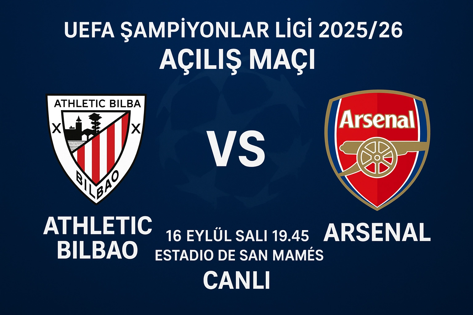 UEFA Şampiyonlar Ligi’nde heyecan başlıyor. Devler Ligi’nin yeni sezonunda, Athletic Bilbao ve Arsenal kozlarını paylaşacak. Estadio de San Mamés’te oynanacak maç, saat 19.45’te başlayacak ve spor kanallarından canlı olarak yayınlanacak. Hakem Donatas Rumsas düdük çalacak.