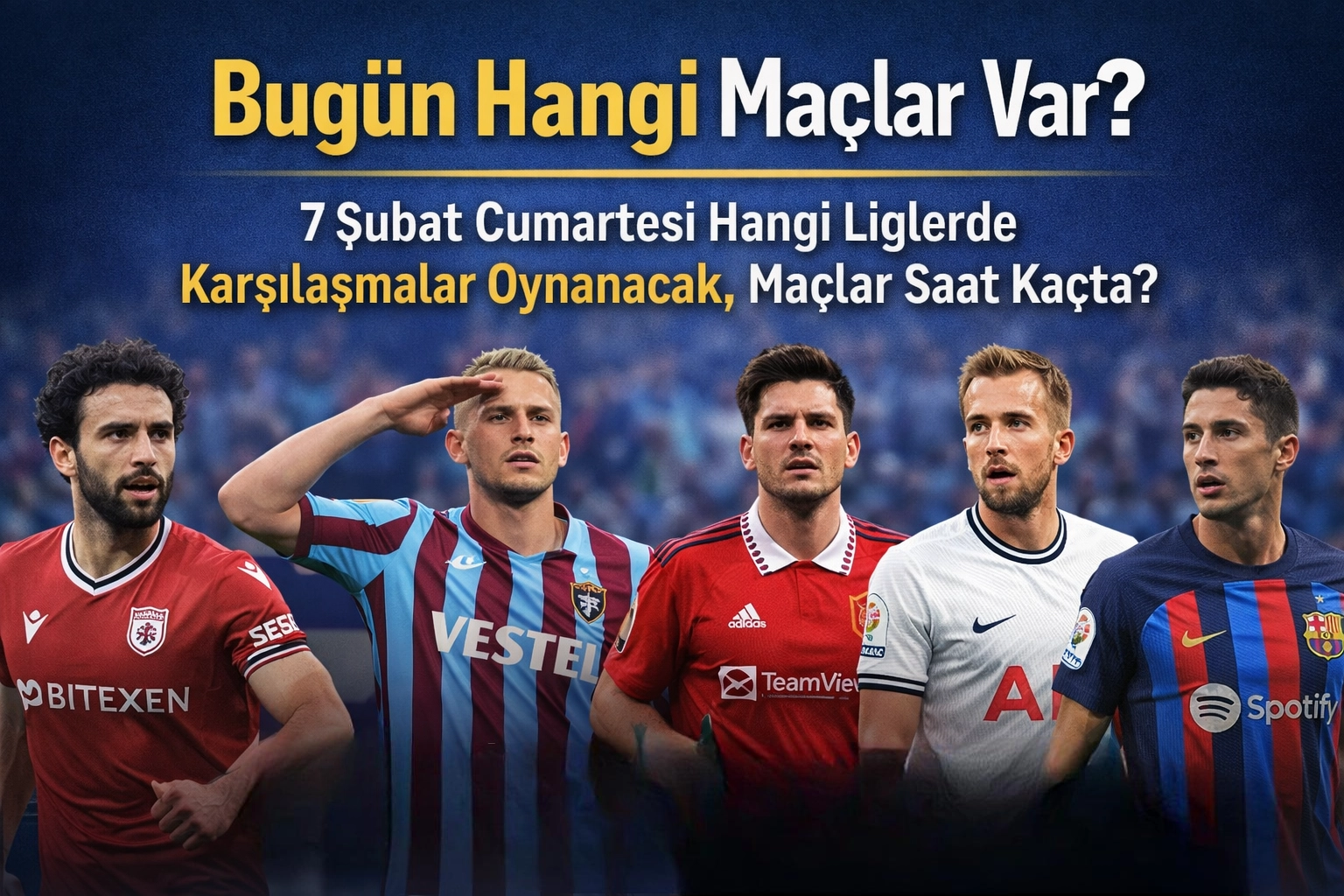 Futbolseverlerin merakla takip ettiği 7 Şubat Cumartesi maç programı belli oldu. Bugün Süper Lig, Premier Lig, Bundesliga, La Liga, Serie A, Ligue 1 ve TFF 1. Lig başta olmak üzere birçok ligde kritik karşılaşmalar oynanacak. Günün öne çıkan maçları ve saatleri futbol tutkunları tarafından araştırılıyor.